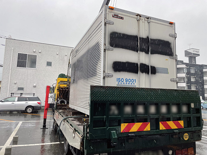 コンテナの設置時は、大型クレーン車で吊り上げ、指定の場所へ設置して頂きました。