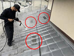 下記の画像で丸印をしている箇所は、仮設足場の部材がのっていた場所や死角になる場所です。